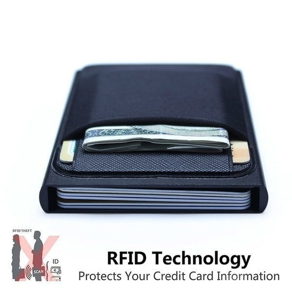 Radio-frequency identification (RFID) skimming is a form of digital theft that enables information from RFID-equipped credit cards to be read and duplicated. RFID blocking wallets block RFID signals using electromagnetic enclosure technology called a Faraday cage.